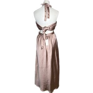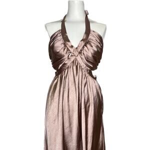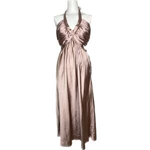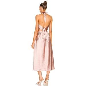 Keywords: Line & Dot Emma Cut Out Midi Dress, Size M, Satin Mauve, New with Defect, Hidden Side Zipper Closure, Halterneck, Back Tie Closure, Side Cut-Out, Unlined, Waterstain Area, Special Occasion Dress, Revolve