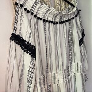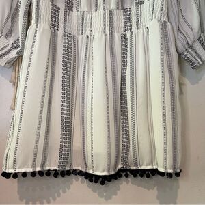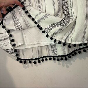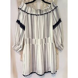 Line & Dot Mini Dress SZ MED Off the Shoulder Smocked Monochromatic Pom Poms