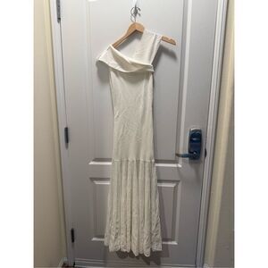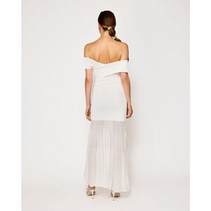 Chic off-shoulder style. Flowy pleated skirt. Ideal for elegant events.