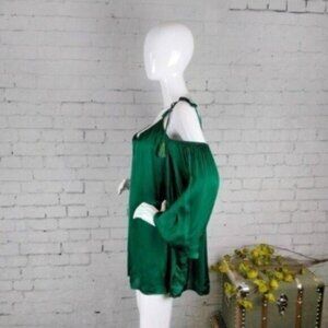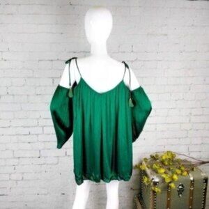 -Features: Line + Dot cold-shoulder dress, flowy fit, tassel ties at the shoulders, 3/4 bell sleeves, mini length, flowy fit, forrest green mini dress, long sleeve cocktail dress