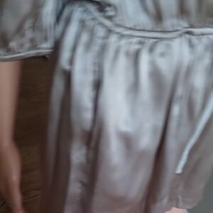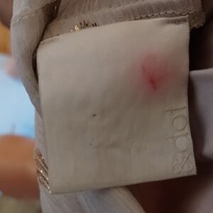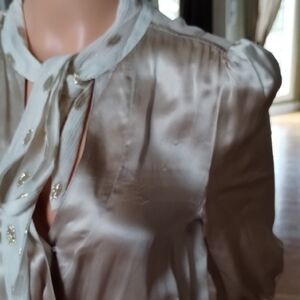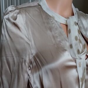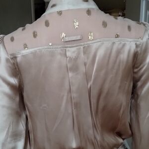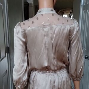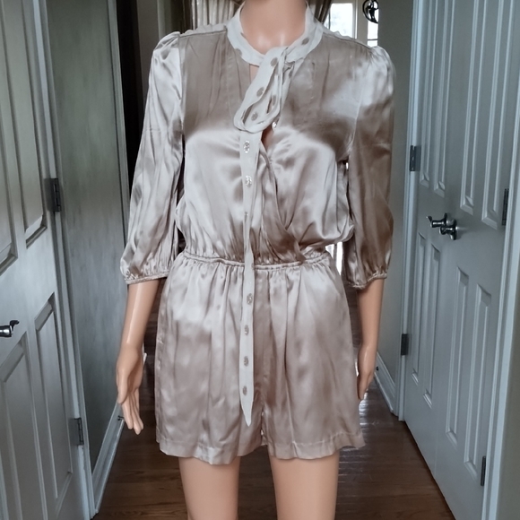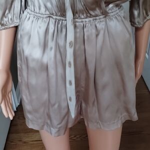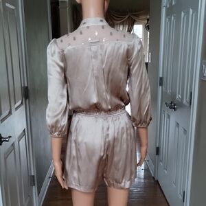 Indulge in luxurious comfort with this elegant Line & Dot romper. Elastic waistband. Adorable sheer polka dot shoulder, collar, and neck tie feature.