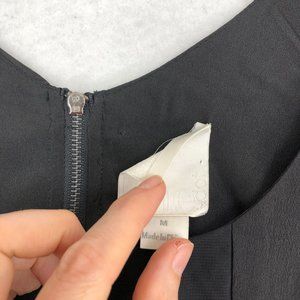 Women's black chain detail sleeveless crepe tank top, blouse. Scooped square neckline, silver-tone chain detail on front, exposed back zipper closure.