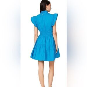 Dramatic ruffle sleeves and a mockneck give a high-fashion look to this ocean blue mini by Line + Dot.