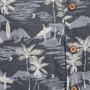 Laid-back coastal style featuring a scenic tropical print of surfers, palm trees, and a moonlit shoreline.