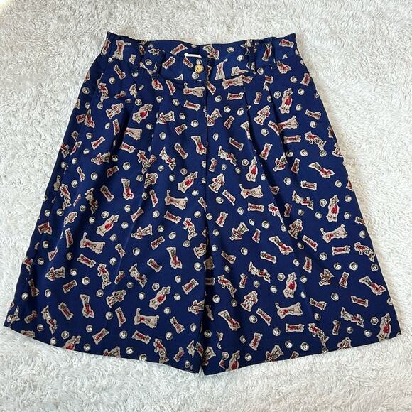 Fetching navy shorts with fun golf print. Features a high waist, slash pockets, belt loops, and elastic at sides for a comfy fit. There is a bit of stretch thanks to the elastic, but not too much.