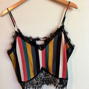 Cropped camisole with green, yellow, white and red stripes. Black lace trim on top and bottom. Adjustable straps.