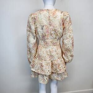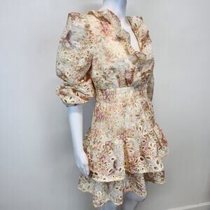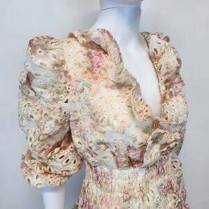 Line and Dot Meadow Mini Dress Size M Eyelets Blouson Sleeve Ruffle Neck Lined