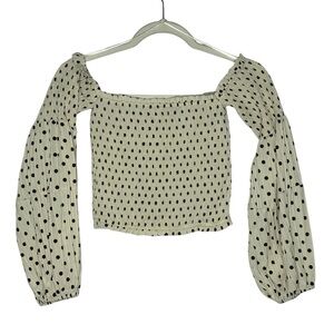 This gently used Line and Dot off-shoulder blouse features a timeless polka dot print on a lightweight, textured fabric. The design showcases a flattering smocked bodice, voluminous long puff sleeves with elastic cuffs, and a ruffled hem for a chic, feminine look. Perfect for casual outings or dressed-up occasions.