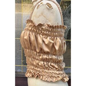 Materials: 100% polyester Measurements: - incredibly stretchy, hard to get, theses are all laying flat, unstretched Pit to Pit: 14" | Length Collar to Hem: 13"| Details: buttons up front, gold beige satin, ruched