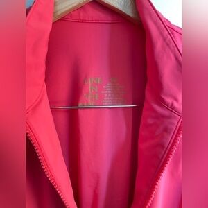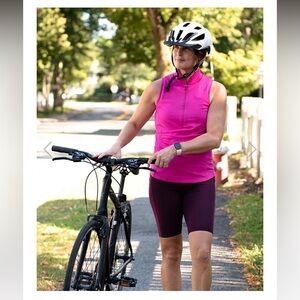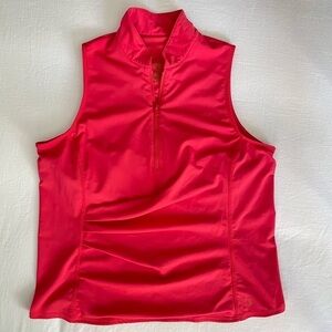 ruched, gathered, swim top, rash guard, biking top, bike top, beach top, summery, bright pink, front zip, mock neck, tennis tank top, stretchy, stretch, athletic, sporty, athleisure