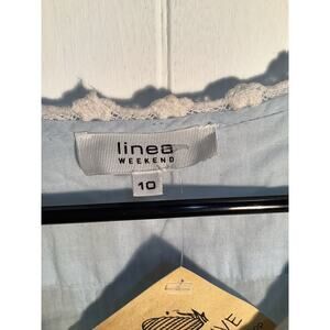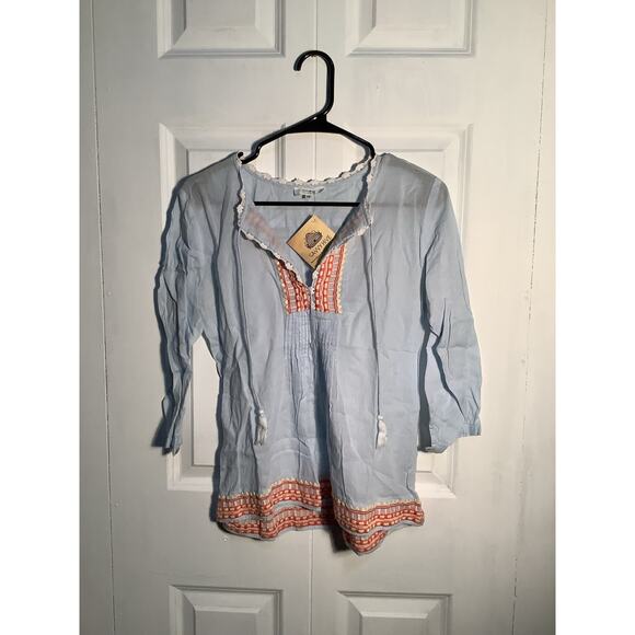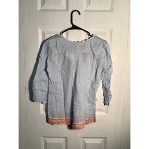 Linea brand light blue blouse with 3/4 sleeves and embroidery at hem and neckline. Great pre-loved condition.