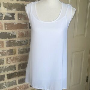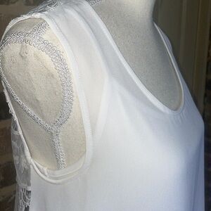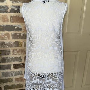 Linea Domani Limited Collection Bright White Lace Back Swing Top Size 6. Front is sheer with an intricate full lace back. Polyester. Very lightweight. Brand New never worn. Approximate measurements in photos.