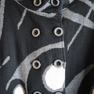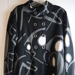 Beautiful black, gray, and white geometric print long double breasted sweater wrap. Could be worn alone, or as a layer of a top. But, most likely as an outer layer. Material is 50% wool, 50% acrylic. Very soft, thick, and warm.