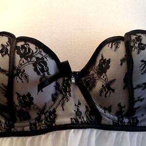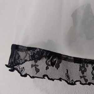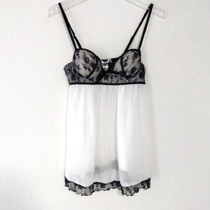 White babydoll with black lace trim. Pullover style, sheer body, lined and lightly padded cups with black lace overlay and bow detail. Adjustable straps.