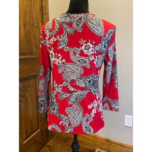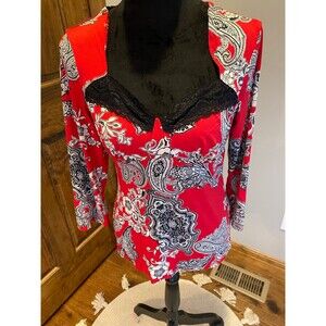 Linea Donatella Size Small Red Black Paisley Top w/Lace Neckline Sexy!