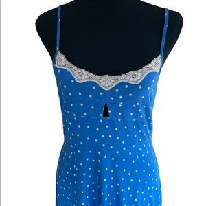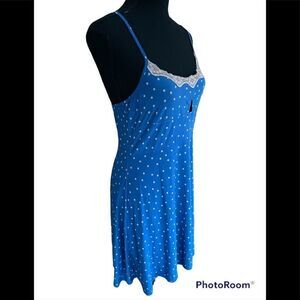 Linea Donatella slip style lace trimmed nightgown with adjustable straps, size S. Polyester spandex blend, keyhole front. Approximate measurements are pit to pit flat 16”.