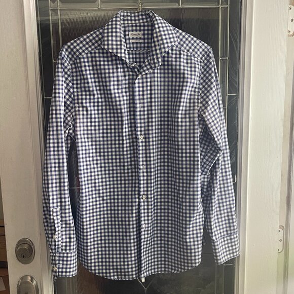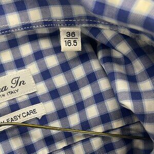 PLEASE SEE LIGHT RING COLLAR STAIN IN LAST PIC The Linea In Men's Dress Shirt in size 16.5 features a classic blue and white check pattern, made from 100% cotton fabric. This 2-ply shirt is easy to care for and machine washable, making it a convenient choice for any man's wardrobe. With a collared neckline, button closure, and regular fit, this shirt is perfect for formal occasions or everyday wear. Designed in Italy, this shirt exudes a timeless and sophisticated style that is sure to make a statement in any setting.