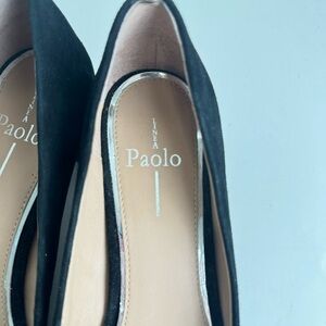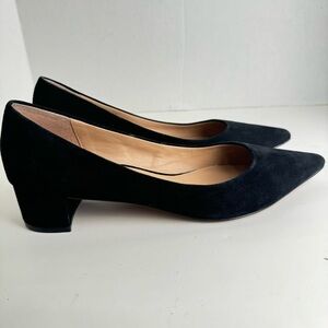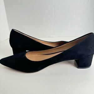 Linea Paola Bardot Pointed Toe Black Suede Pump Stacked Heel Shoe