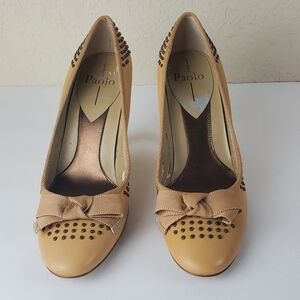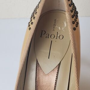 Linea Paola Tan Studded Heels Round Toe Size 7.5. Tan with studded bronze accents. Bow on toe. 3" heel. Brown stacked heel. Gently used - see pictures. Some wear on the inside but look gorgeous on the outside. Perfect neutral heels.
