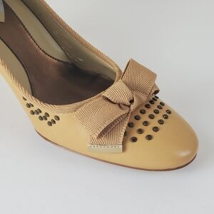 Linea Paola Tan Studded Heels Round Toe Slip On Bow Accent Size 7.5