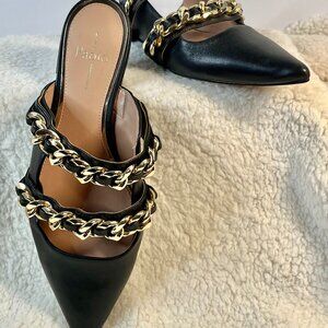 Linea Paolo Aurel Mules | Black Pointed Toe Flats w/ Double Chain | Size 8.5