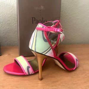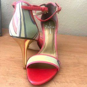 Feisty-Sassy Pump by Linea Paolo. Never been worn! High gold heel with pink, yellow, & green pattern. Ankle strap, patent leather, size 9M. Such a fun shoe for evenings out... Tropical feel.