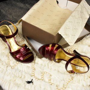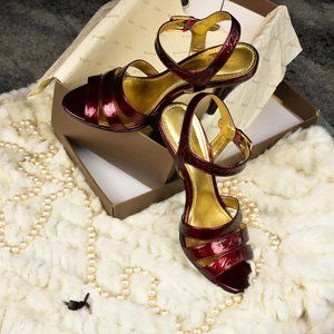 Linea Paolo from Nordstroms. One of my favorite pairs of day to night heels. Worn more than twice, but well cared for and only in mostly carpeted environments. Very very comfortable and a really cool shade of metallic red. Also available in a gunmetal color (see other listing). No box to include, but those heel caps belong to this pair and will come with purchase! Thanks for looking and let me know if you have any questions. Make an offer!