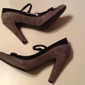 Shoes are suede. Grey and black. Grey suede with black patent leather accents, straps and bow. Size 7.5. Heels 3"-4" high. Worn twice. Shoes are in like new condition. Measurements are approximate. Look at photos carefully and ask questions. No shipping on Saturdays or Sundays. Not on site Sundays.