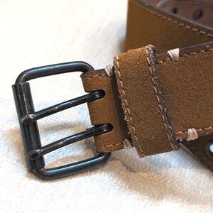 Linea Pelle Double Prong Suede Leather Belt. This wide belt features gunmetal hardware, double prongs, leather loop, double grommetted holes, and tan stitching. 100% leather. Size M.