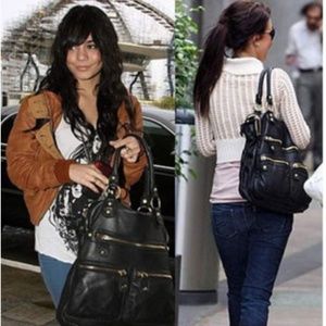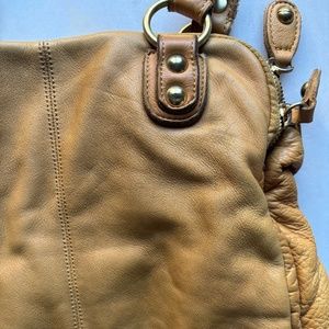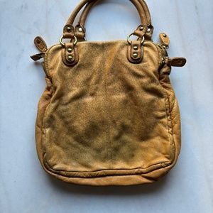 Linea Pelle Dylan Bag Tan/Yellow color with brushed gold hardware. Thick buttery leather. 3 separate compartments , outside pockets and inside zip. This bag holds a TON! Used condition, lots over color transfer on the back, corners and handles. Would be a beautiful bag to dye. It would last forever. Clean inside. Smoke free, pet free home. 15inches tall 13 1/2 wide