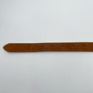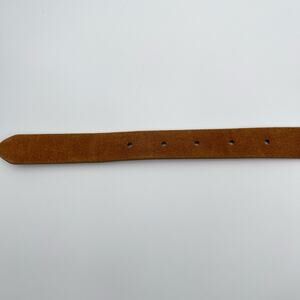 Beautiful cognac brown suede leather belt with notches running the entire length and a round brass buckle.