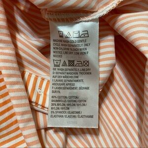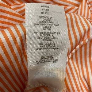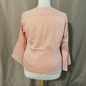 This Linea by Louis Dell Olio top is in excellent preowned condition. It’s marked as a plus size 20W. The fabric is a cotton blend in a white and orange pattern. It has beautiful statement bell sleeves. Front closes with all original buttons.
