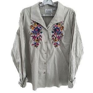 Linea by Louis Dell'Olio Tan Stripe Colorful Embroidered Flowers Blouse Size XL