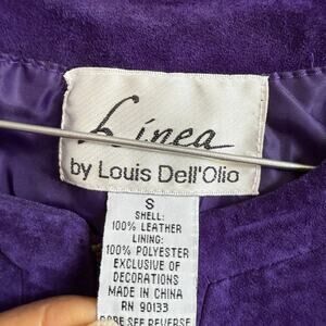 This is a pre-owned Linea by Louis Dell'Olio jacket, size S. The shell is made of 100% leather and the lining is 100% polyester. The jacket is purple and features a gold zipper and gold studs. It has a round neckline and long sleeves. There are no visible imperfections. The jacket is in good condition.