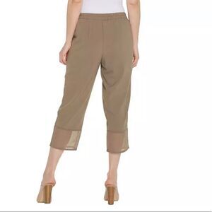 Features: pull-on style, crop length, elastic waistband, mixed media detail at calf