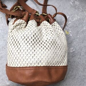 Super nice perforated leather drawstring bag. That is in excellent condition. Check out the pictures. Inside is clean. Hardware is all good. Adjustable shoulder strap. Open and flat is approximately 12 x 11 x 8