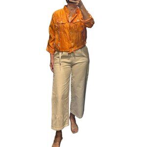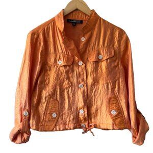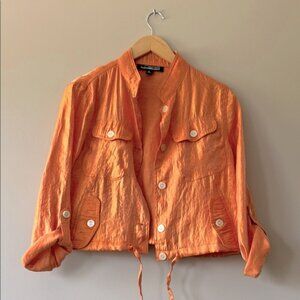 This vibrant orange (with a shiny sheen to the material - see picture 10) utility jacket is a standout piece with its lightweight design and relaxed texture. Featuring a drawstring waist and cuffed sleeves, it offers a casual yet structured look perfect for everyday wear.