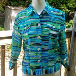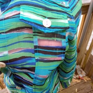 Linear jean-jacket-style teal/blue/green/black/sheer light weight jacket szPS