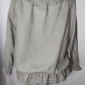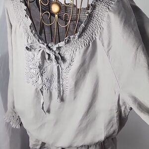 100% Linen August Silk Size M Embroidered and smocked blouse that could be worn off the shoulders.