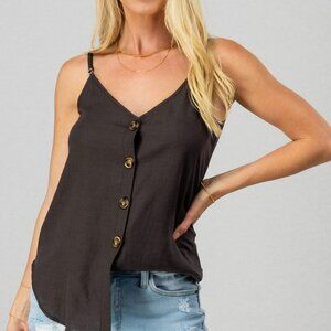 This colorful linen cami with adjustable straps and coconut buttons is the perfect go to summer top! Dress it up or dress it down, it will keep you cool and comfy wherever your summer fun takes you!