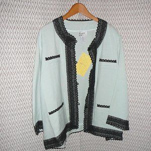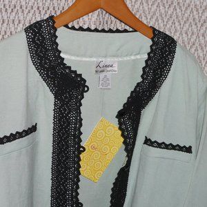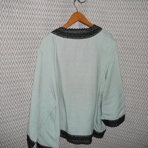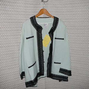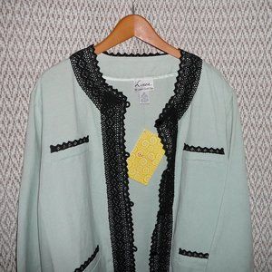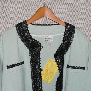 New with tag, mint green linen blazer with crocheted black lace trim.