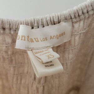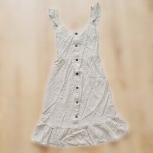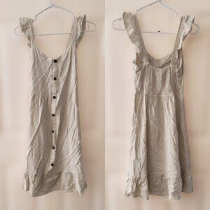 Form-fitting midi dress with ruffled sleeves, flared hem and faux-button design. 80% rayon and 20% linen for a nice organic look and feel. Stretchy back. Super easy to layer and style, making it suitable for any season! Fits snugly around the hips with a flattering neckline. Worn lightly.