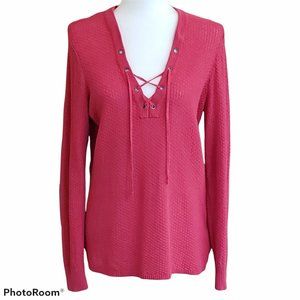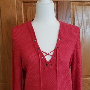 Linen Blend Lace-Up V-Neck Tunic Longline Waffle Knit Sweater Size Large