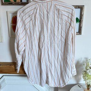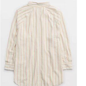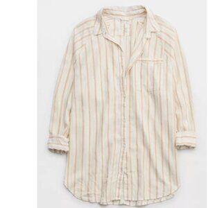 Linen Blend Oversized Button Down Shirt - Tan Vertical Stripes