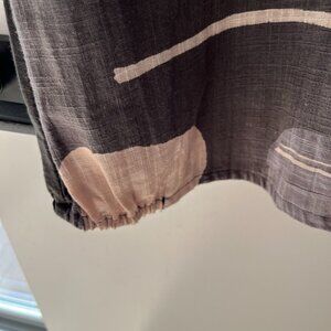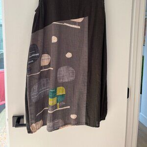 Charming linen blend sleeveless sheath dress in charcoal grey with colorful inserts front and back that channel the "mod" mid-century. Knee-length with gathered side hem detail. Pull over design (no zipper). Very light fabric--perfect for hot summer days or evenings (hand wash recommended). Fun, comfortable, and unique! Size L (would fit dress size 12-14)