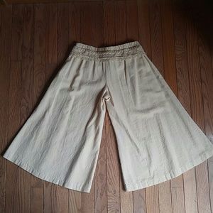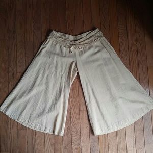 Boho chic, linen blend, wide-leg culotte cropped pants from Anthropologie/Urban Outfitters brand, Damsel. Elastic waist and crochet tie detail. No size tag, but fit like a small. Super cute for the beach, or dressed up! On trend. Excellent used condition. No stains, holes. Haven't been worn in years. From a pet and smoke free home.