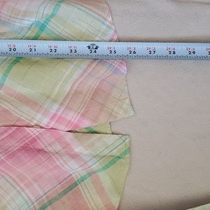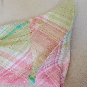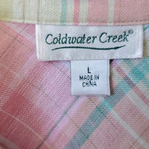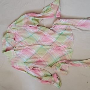 FREE SHIPPING! Pretty, summery colors, cool and breezy top. Give it shape with the belt tied in front or more casual look, tied in back. Hidden buttons and cute cuff detail, or roll up the sleeves. 98% Linen. At this price, it's a summer "must have" in your closet!