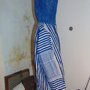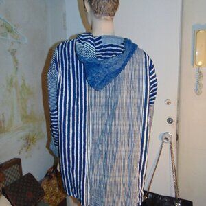 Elevate your coastal look with this blue striped linen jacket/coat. The mid-length coatigan features a hood and button closure for a relaxed fit. The thick woven linen cotton fabric type adds to the lightweight design, making it perfect for summer, fall, or spring. Ideal for travel or casual occasions, this jacket has pockets to store your essentials. The relaxed fit and coastal theme make it a classic addition to your wardrobe. Handmade with care, this coatigan is available in size 1X and is perfect for plus-sized women. Mixed media patterned patchwork