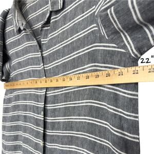 Lightweight, relaxed fit, button front collared linen top. Tunic length with 3/4 sleeves and side slits. Gray/White stripe. Can also be worn as a light open front shacket (shirt jacket). Habitat "Clothes To Live In" —Measures as Women's size L. Pit to pit ≈22 inches Length ≈31 inches.