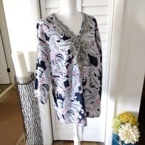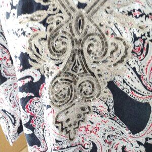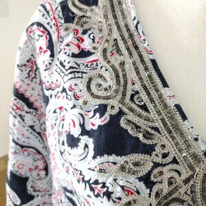 Linen Charter Club Paisley Tunic Top Blouse PL Petite Sequin V Neck 3/4 Sleeves